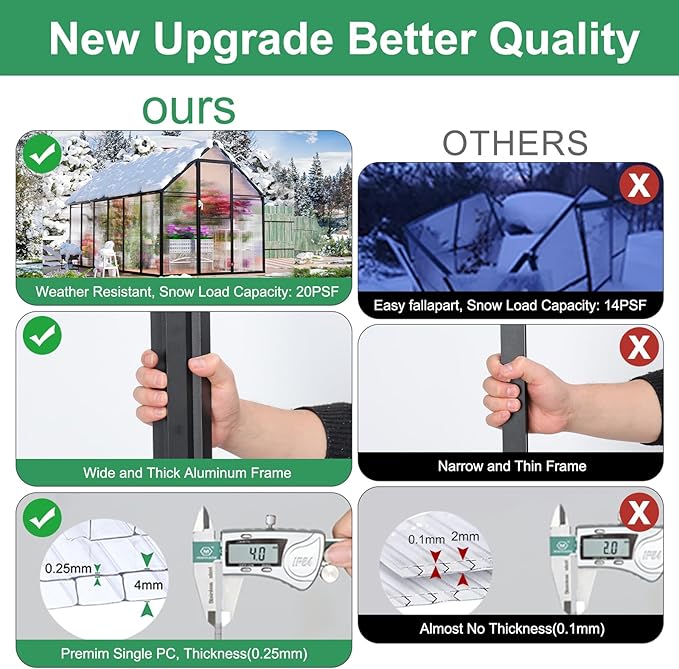 - 🌻Sturdy Frame: Our greenhouse kit boasts a robust rust-resistant aluminum frame designed to withstand various weather conditions. 2 skilled enthusiasts can assemble this greenhouse kit within just 4-6 hours. Introducing patented technology, Easy assembly, saving you 50% of your time. Gone are the days of tedious setups. With a simple push and locking screw, our Quick Connect ensures a reliable, secure, and swift link-up. It can also support snow loads of up to 20PSF.