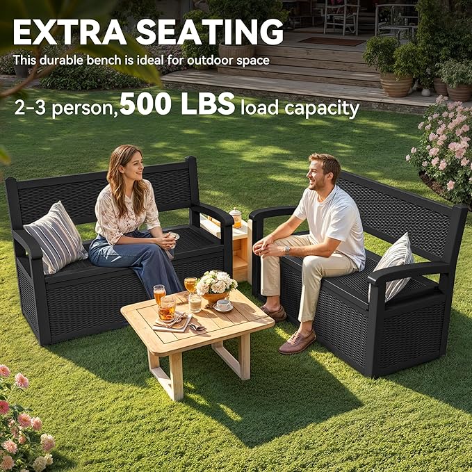 - Cozy Extra Seating: Transform your porch or garden with this deck bench with storage--a comfy storage box bench that seats two or three and supports up to 500 lbs., making any sunny afternoon into a relaxing retreat