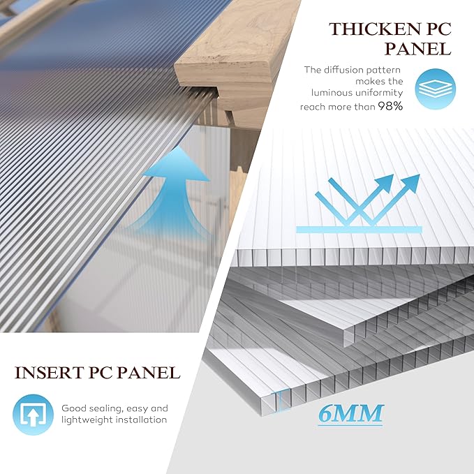 - Inserted multi-layers PC Panel: Composed of clear and translucent polycarbonate panels, provide 99.99% UV protection. The polycarbonate panel greenhouse offers enough sunlight and blocks damaged UV rays, which helps your plants grow better.