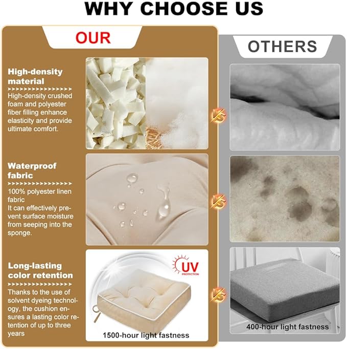 - ☝PREMIUM DUAL-LAYER FILLING: These cushions feature a scientifically balanced blend of shredded high-rebound foam and PP fiberfill. The shredded foam provides dynamic, contoured support and quickly rebounds after compression, while the PP fiber adds structural strength and maintains its shape over time. Deep tufting secures both fillings, preventing them from shifting and ensuring the cushion remains intact