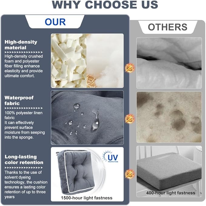 - ☝PREMIUM DUAL-LAYER FILLING: These cushions feature a scientifically balanced blend of shredded high-rebound foam and PP fiberfill. The shredded foam provides dynamic, contoured support and quickly rebounds after compression, while the PP fiber adds structural strength and maintains its shape over time. Deep tufting secures both fillings, preventing them from shifting and ensuring the cushion remains intact