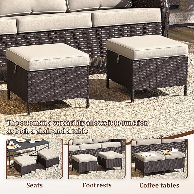 - MULTIPURPOSE DESIGN:Use these patio ottomans as footrests to put your feet up and relax after a long day or as extra seats when you have guests over. Plus, they can easily transform into convenient coffee tables for your drinks or other items